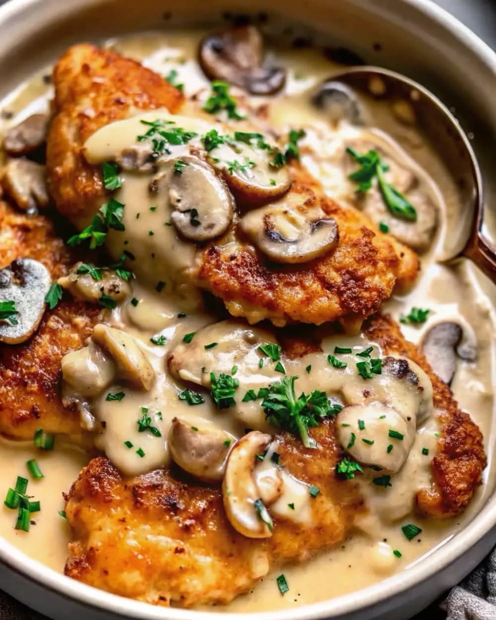 The contrast between the crunchy chicken and the smooth, cheesy mushroom sauce creates an irresistible balance of textures and flavors. Served with pasta, mashed potatoes, or rice, this dish feels luxurious yet approachable.