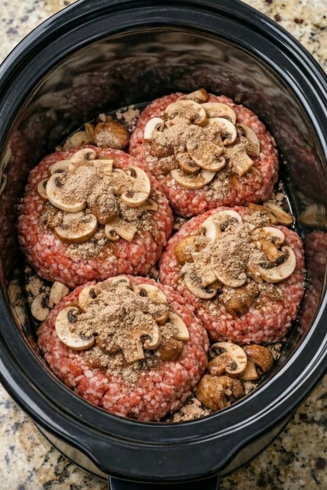 Place the sliced onions and mushrooms in the bottom of the slow cooker. Arrange the patties on top.