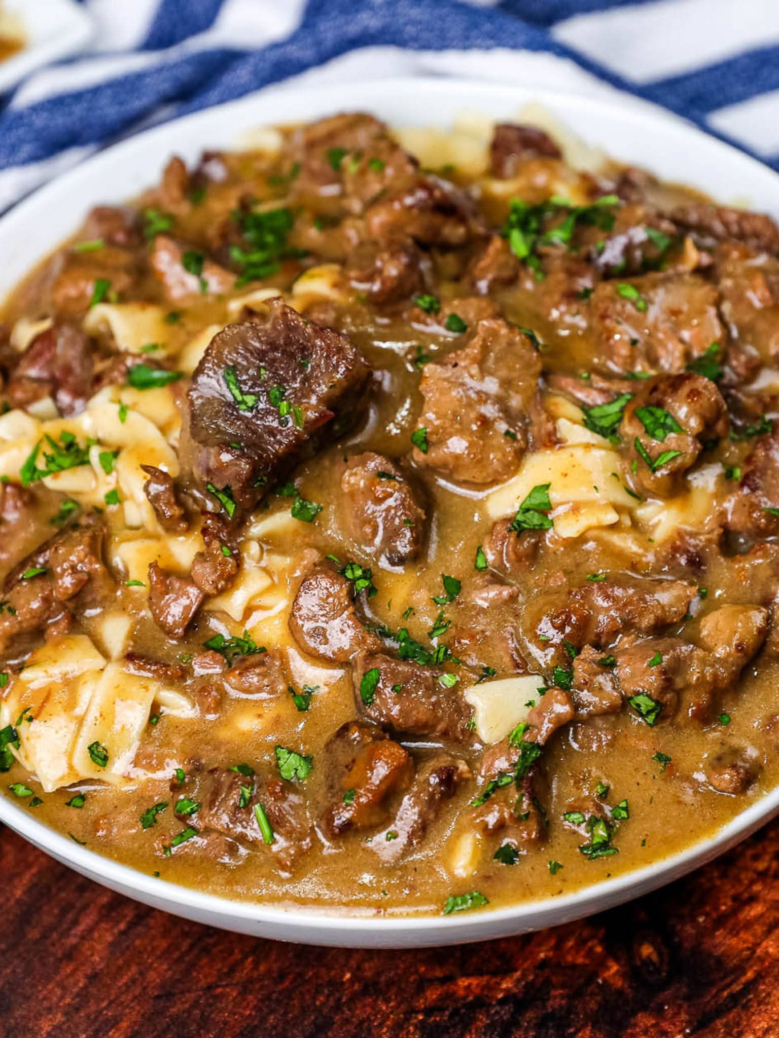A rich, comforting classic recipe with tender beef in a savory gravy served over buttery egg noodles.