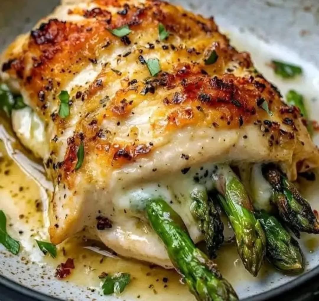 Whether you’re preparing a weeknight family dinner, hosting guests, or planning a special meal, this recipe delivers both flavor and presentation. When sliced, the vibrant green asparagus and melted cheese create a stunning contrast against the perfectly cooked chicken.