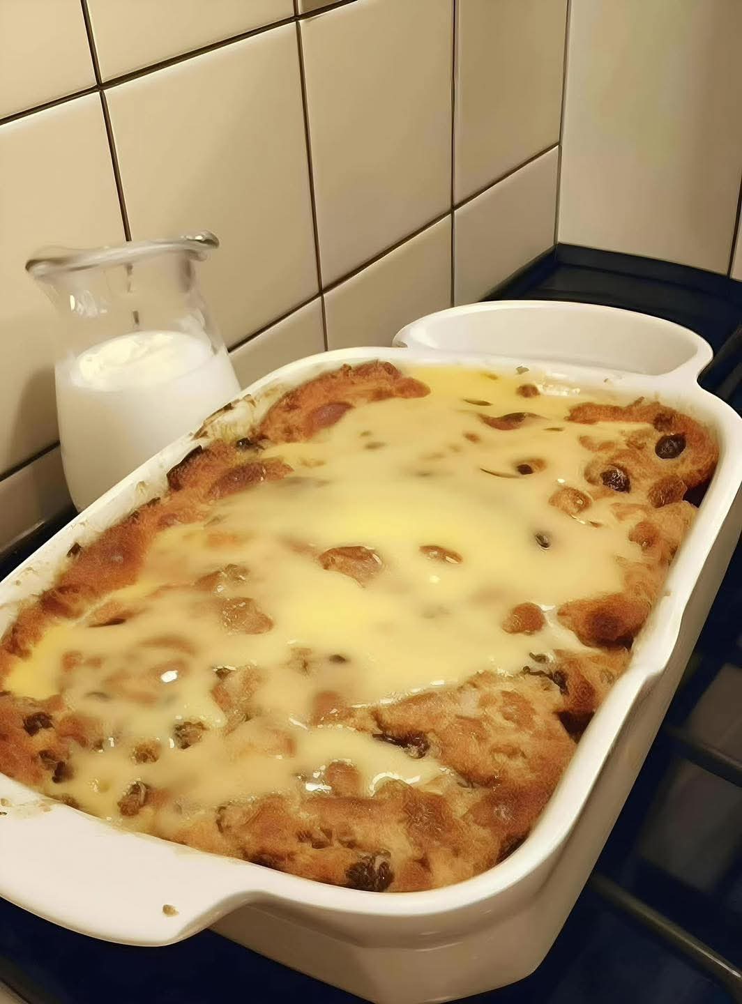 If using raisins, sprinkle them evenly over the top or mix them into the bread before pouring the custard.