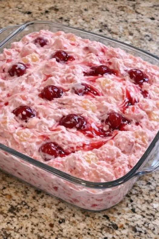 This recipe is loved because it is simple, affordable, and requires no baking. The combination of cherries, pineapple, marshmallows, and whipped topping creates a fluffy, creamy texture with a refreshing fruity flavor. When frozen slightly, it becomes a cool and delicious dessert that melts softly in your mouth.