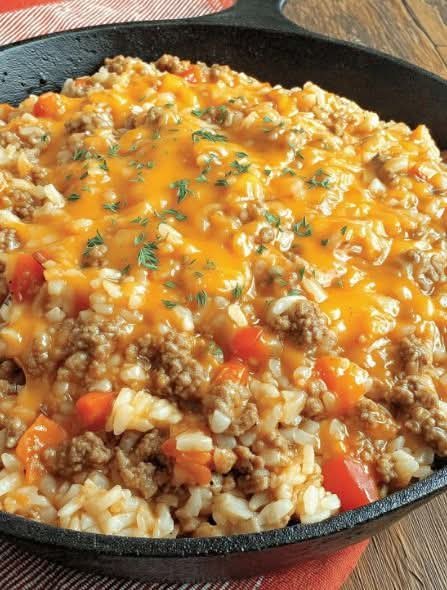 One of the best things about this recipe is how simple and convenient it is. Everything cooks in a single skillet, which means less cleanup and more time to enjoy your meal. The combination of seasoned beef, aromatic onions and garlic, and cheesy queso sauce creates a bold flavor that pairs perfectly with the tender rice.