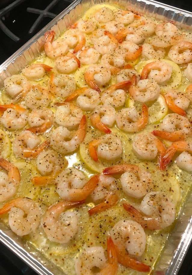 Once the shrimp are arranged, pour the lemon butter mixture over them.