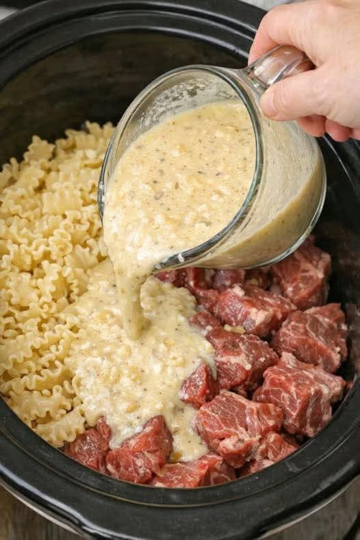 Add the cooked pasta directly into the slow cooker with the shredded beef and creamy sauce.