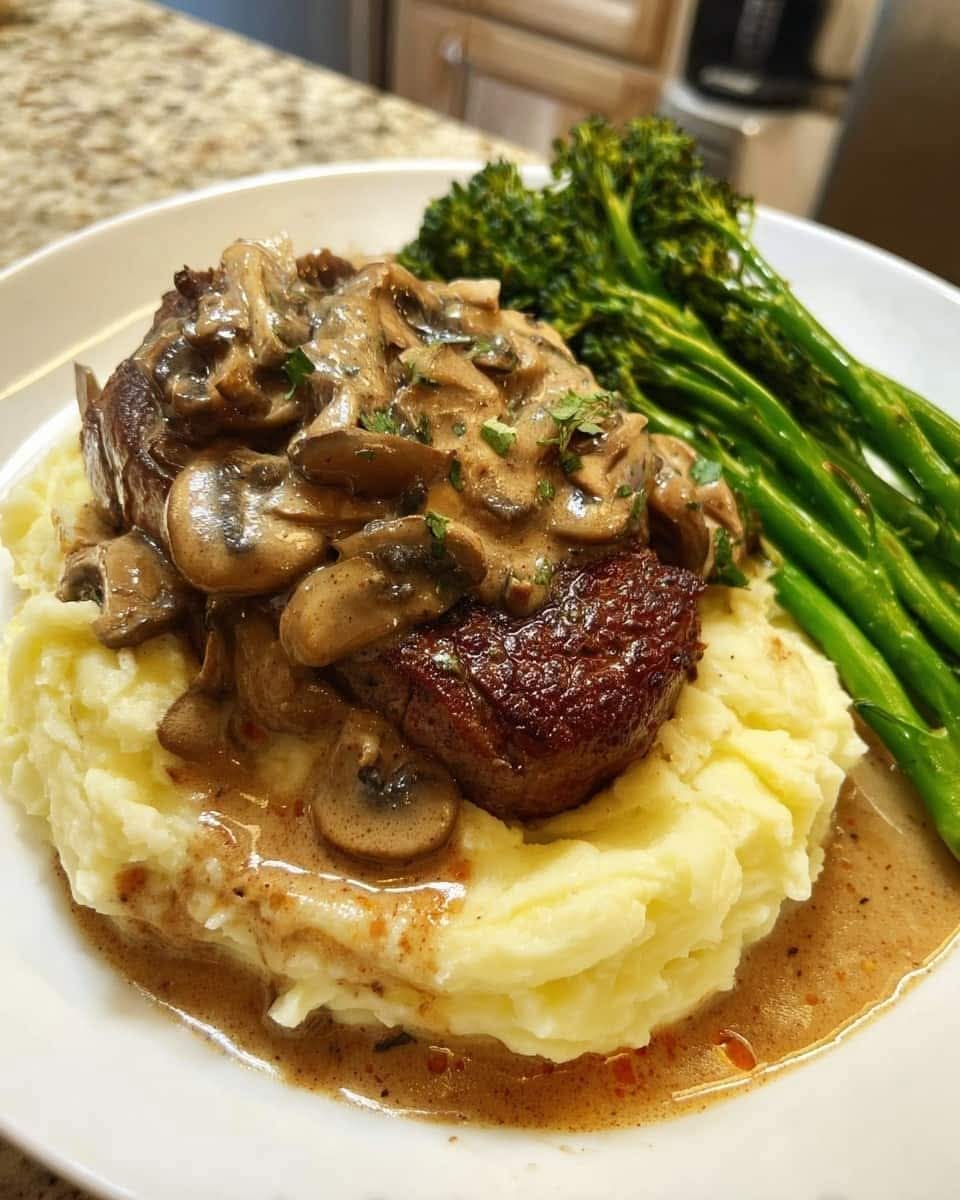 This dish is inspired by classic steakhouse dinners, where perfectly cooked steak is paired with creamy sauces and comforting sides. The savory flavor of mushrooms, garlic, and butter creates a luxurious sauce that coats the steak beautifully, while the mashed potatoes provide a soft and creamy base that absorbs every drop of the sauce.