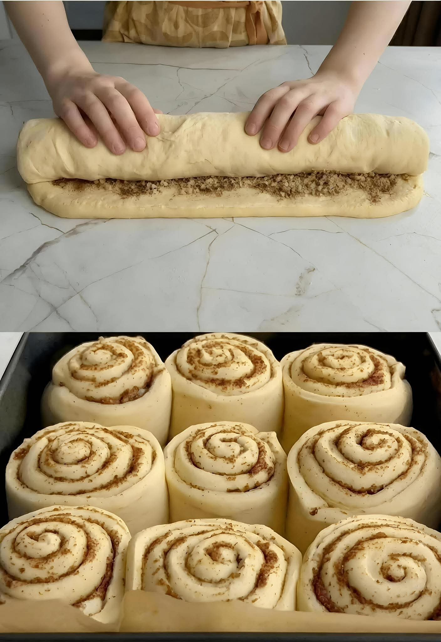Cover the baking dish with a towel and allow the rolls to rise again for about 30–45 minutes until they become slightly puffy.