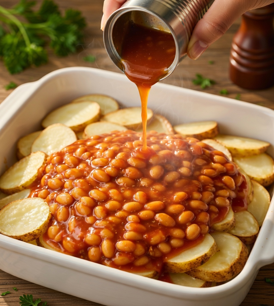 Next, spoon half of the baked beans (including the sauce) evenly over the potato layer. The sauce will help cook the potatoes and infuse them with flavor.