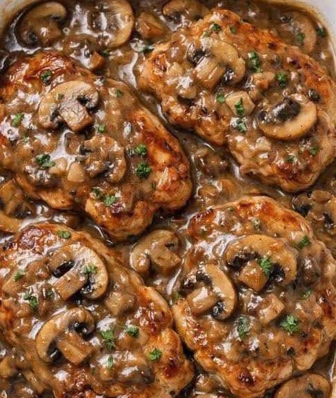 - Pour the mushroom cream sauce evenly over the pork chops