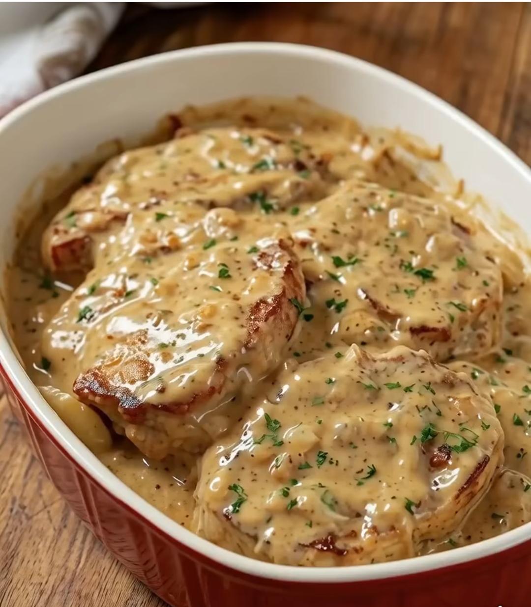- Pour the creamy mushroom sauce evenly over the pork chops.