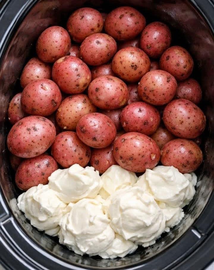 Next, lightly grease your slow cooker with a bit of butter or cooking spray. This helps prevent sticking and makes cleanup easier later on. Add the prepared potatoes into the slow cooker and spread them out evenly.