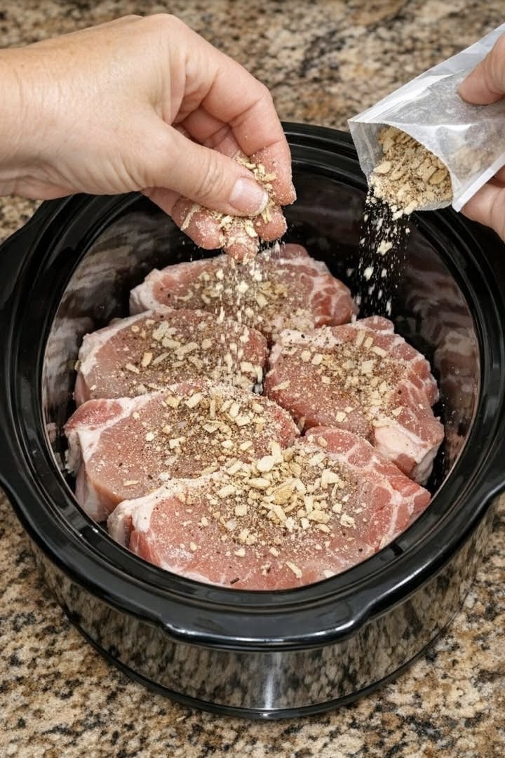 Sprinkle the onion soup mix evenly over the pork. Then, pour in the cream of mushroom soup.
