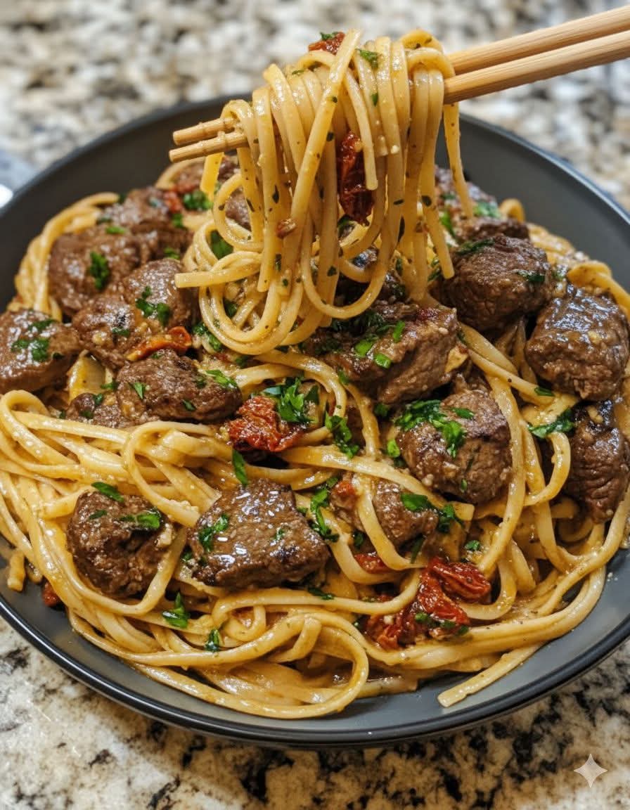 If you’re looking for a rich, indulgent pasta dinner that feels restaurant-quality but is easy to make at home, this Garlic Butter Beef & Sun-Dried Tomato Linguine with Mozzarella is the perfect choice. Tender beef cooked in garlic butter is tossed with silky linguine, sun-dried tomatoes, and a creamy cheese sauce that melts beautifully into every bite.