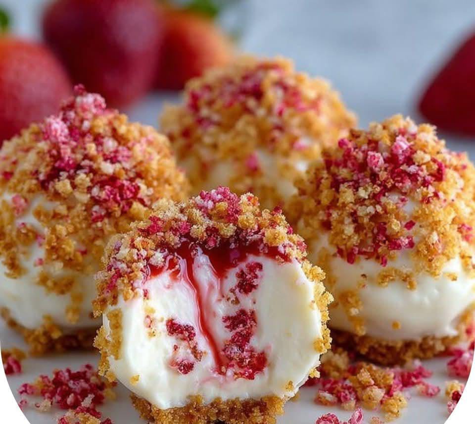 - Roll each chilled cheesecake bite in the strawberry crunch mixture.